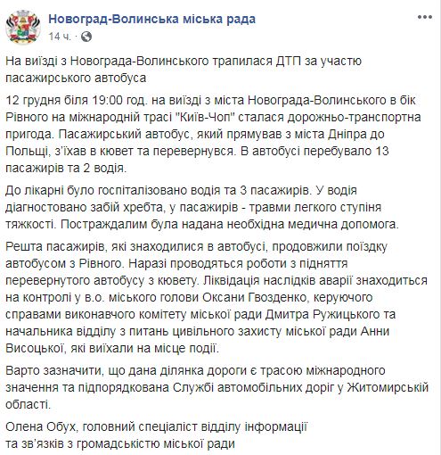 "12 декабря около 19:00, на выезде из города Новоград-Волынского в сторону Ровно на международной трассе Киев-Чоп произошло дорожно-транспортное происшествие. Пассажирский автобус, следовавший из города Днепр в Польшу, съехал в кювет и перевернулся. В автобусе находились 13 пассажиров и 2 водителя", - говорится в сообщении.