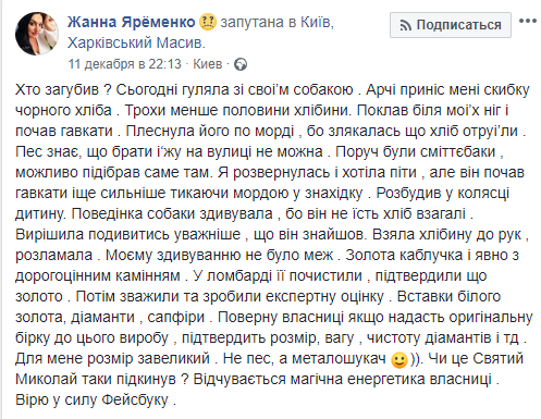 "Арчи принес мне кусок черного хлеба. Положил возле моих ног и начал лаять. Поведение собаки удивило, потому что он не ест хлеб вообще. Решила посмотреть внимательнее, что он нашел. Взяла хлеб в руки, разломала. Моему удивлению не было предела. Золотое кольцо и явно с драгоценными камнями", - написала Жанна Яременко в соцсети.