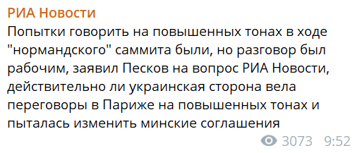 Пресс-секретарь президента Российской Федерации Дмитрий Песков подтвердил информацию о том, что в рамках "нормандского саммита" между участниками имел место разговор на "повышенных тонах".