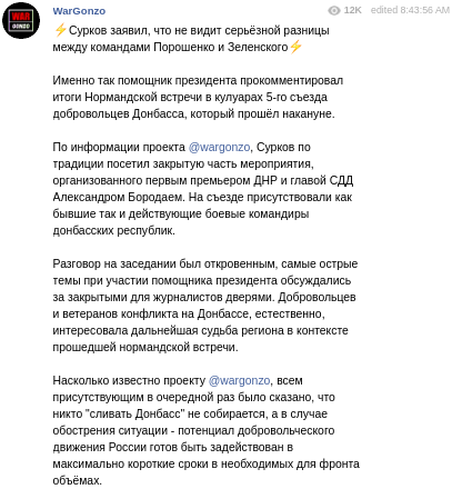"Сурков заявил, что не видит серьёзной разницы между командами Порошенко и Зеленского. Именно так помощник президента прокомментировал итоги "Нормандской встречи" в кулуарах 5-го съезда добровольцев Донбасса, который прошёл накануне" - говорится в сообщении.