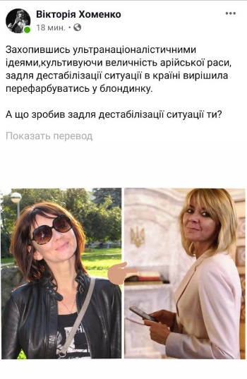 "Увлекшись ультранационалистскими идеями, культивируя величие арийской расы, для дестабилизации ситуации в стране решила перекрасится в блондинку. А что для дестабилизации ситуации сделал ты?", - поинтересовалась она.