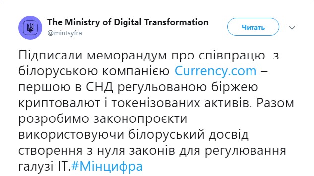 Министерство цифровой трансформации Украины сообщило о подписании меморандума о сотрудничестве с белорусской компанией Currency.com. Об этом в воскресенье сообщила пресс-служба ведомства в Twitter.