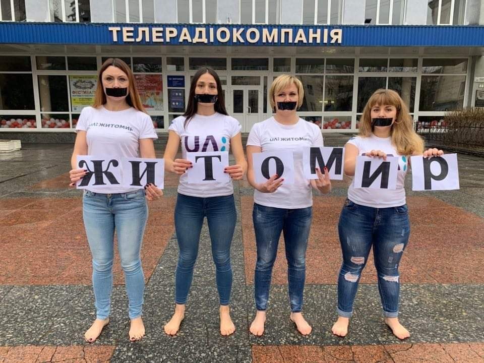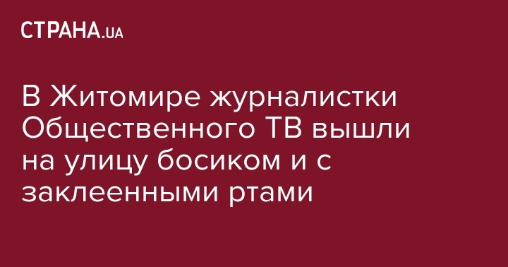 Журналистки Житомирского телевидения заклеили скотчем рты и вышли босиком на улицу, протестуя против  сокращений работников Общественного вещателя в регионах и возможного закрытия утренних региональных программ.