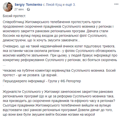 "Очевидно, что на такую ​​крайнюю меру коллег подталкивает тревога, которая в последнее время охватила регионы - в филиалах Общественного обсуждают возможные будущие увольнения. При этом, у людей не хватает информации о конкретике реформирования Общественного в регионах, все боятся сокращений", - говорится в сообщении.