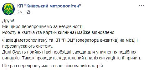 На странице КП "Киевский метрополитен" в Facebook подтвердили, что был сбой, а в 21:00 на коммунальном предприятии сообщили, что специалисты "почти устранили неисправность и уже перезапускают систему".