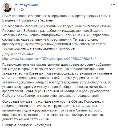 По словам Кузьмина, его смущает, что расследованием коррупции Обамы, Порошенко и Байдена будет заниматься глава НАБУ Сытник, который также был признан судом коррупционером. "Тот самый Сытник, которого обвиняют во вмешательстве в американские выборы в интересах демократической партии США... В общем, продолжение следует...", - подытожил Кузьмин.