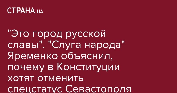 Глава Комитета Верховной Рады по вопросам внешней политики Богдан Яременко, который является депутатом от партии "Слуги народа", объяснил, что Севастополь планируют лишить особого статуса, так как в нем нет необходимости. Яременко добавил, что делать это будут после его деоккупации.