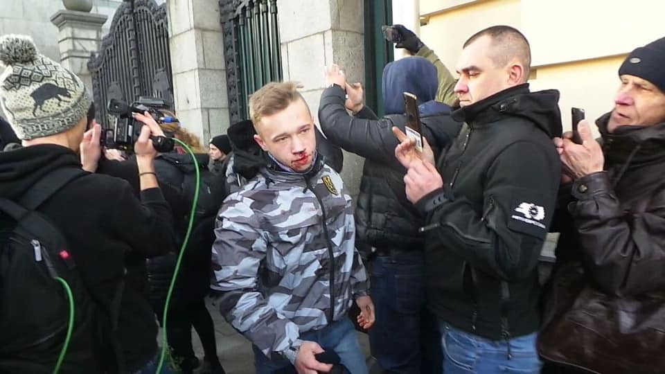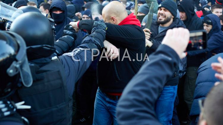 На фото и видео драка выглядела куда жестче, чем в рассказал националистов и полиции. В дело с обеих сторон шли газовые баллончики, правоохранители орудовали дубинками, уличные бойцы Билецкого - вывороченной брусчаткой и просто били полицейских руками и ногами.