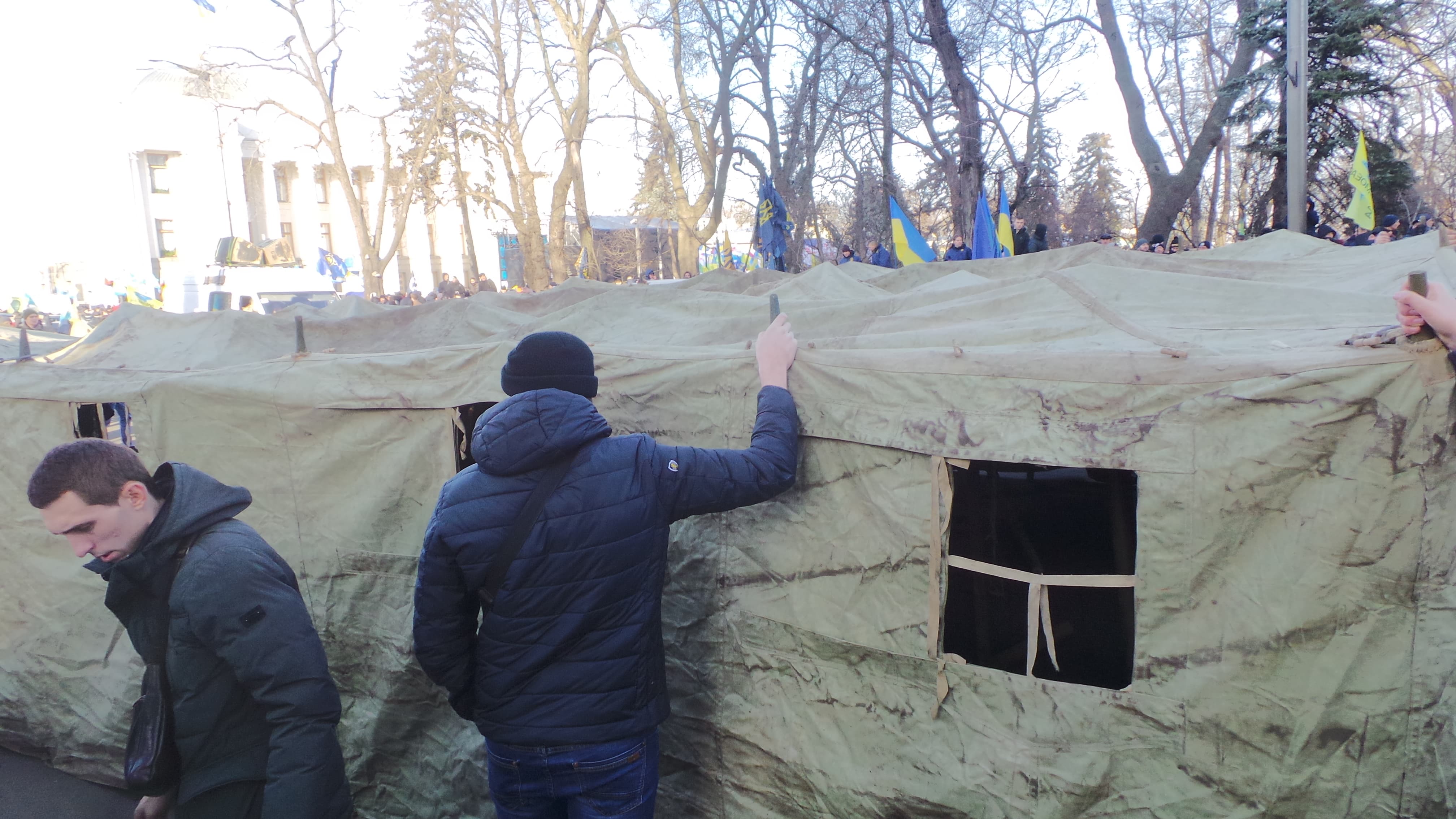Изначально протестующие согласовали с властями сцену и две большие белые палатки напротив парламента. Ситуация начала накаляться, после того, как активисты принесли еще армейский палатки и начали рушить асфальт перфоратором на Грушевского.