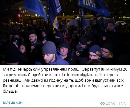 Перед этим активисты, по словам Билецкого, собрались под Печерским управлением полиции и "дали им час" на то, чтобы они отпустили всех. "Если нет – начнем с перекрытия дороги. И нас будет становиться все больше", - заявил он.