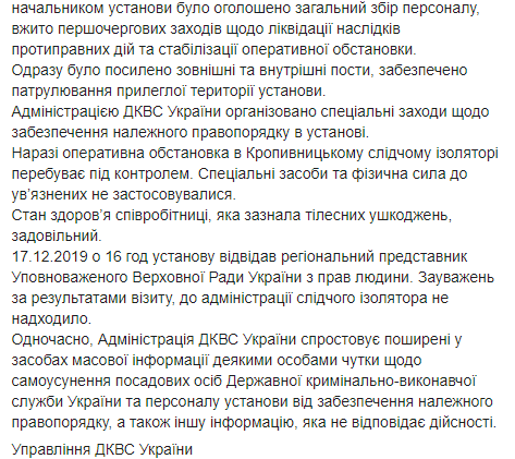 "Сейчас оперативная обстановка в Кропивницком следственном изоляторе находится под контролем. Специальные средства и физическая сила к заключенным не применялись. Состояние здоровья сотрудницы, которая претерпела телесных повреждений, удовлетворительное", - отметили в администрации.