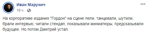 "На корпоративе издания "Гордон" на сцене пели, танцевали, шутили, брали интервью, читали стендап, показывали миниатюры, предсказывали будущее. Но потом Дмитрий устал"