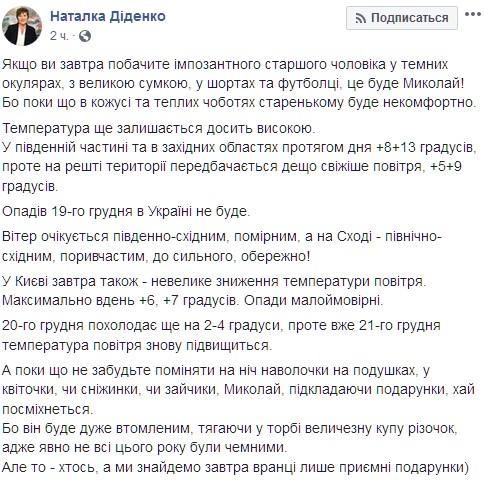 "Если вы завтра увидите импозантного пожилого мужчины в темных очках, с большой сумкой, в шортах и футболке, это будет Николай! Потому что пока в кожухе и теплых сапогах старенькому будет некомфортно. Температура еще остается достаточно высокой. В южной части и в западных областях в течение дня +8+13 градусов, однако на остальной территории предполагается несколько свежее воздух, +5+9 градусов. Осадков 19-го декабря в Украине не будет. Ветер ожидается юго-восточным, умеренным, а на Востоке - северо-восточным, порывистым, до сильного, осторожно!" - говорится в сообщении.