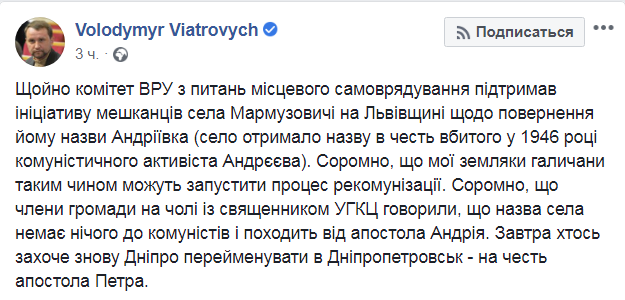 "Только комитет ВРУ по вопросам местного самоуправления поддержал инициативу жителей села Мармузовичи на Львовщине по возврату ему названия Андреевка (село получило название в честь убитого в 1946 году коммунистического активиста Андреева)", - проинформировал подписчиков Вятрович.