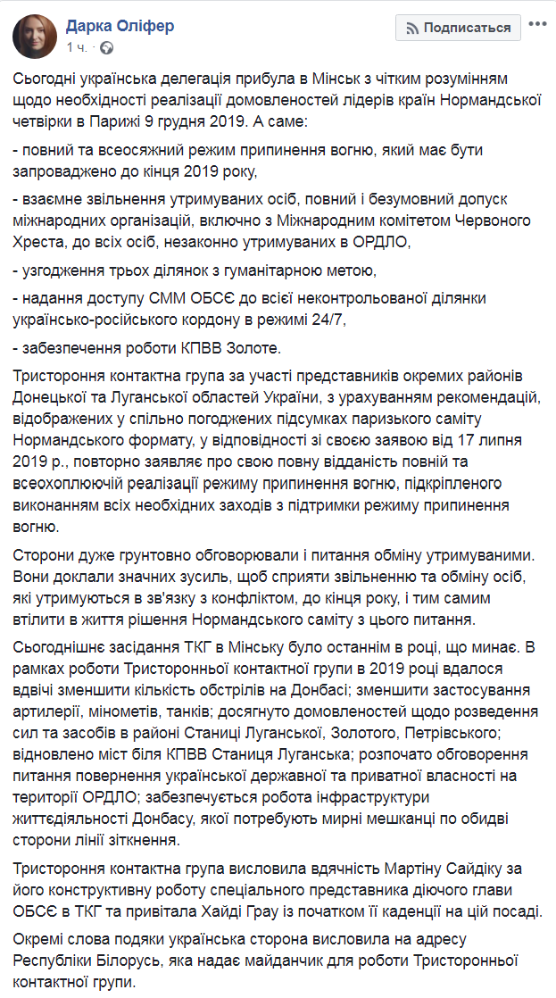Как написала Олифер в Facebook, трехсторонняя контактная группа заявила "о своей полной преданности" реализации режима прекращения огня. Также стороны основательно обсудили тему обмена пленными.