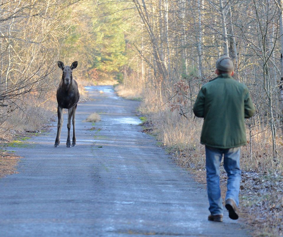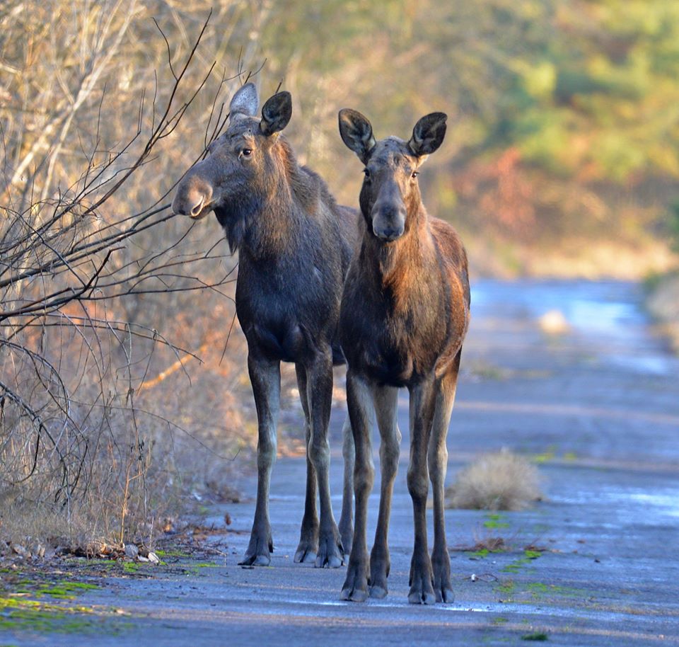 А на лесной дороге ученым, работающим в заповеднике, попалась пара непуганных лосей.