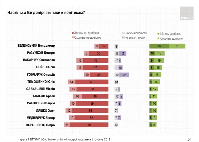 Далее сопредседатель фракции "Оппозиционной платформы – За жизнь" Юрий Бойко (23% и 58%), премьер-министр Алексей Гончарук (22% и 44%) и лидер партии "Батькивщина" Юлия Тимошенко (19% и 74%).