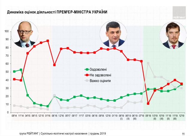 В декабре деятельностью премьер-министра Алексея Гончарука оказались довольны 35%. Это столько же, сколько и недовольных. Еще 30% не смогли определиться с оценкой.
