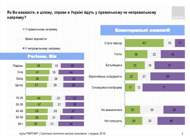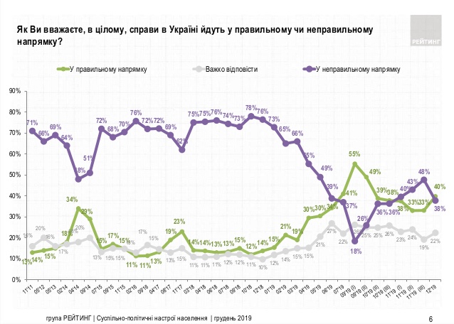 Как показал соцопрос, 40% опрошенных украинцев считают, что страна движется в правильном направлении, 38% – в неправильном, 22% – не смогли оценить. За последние 2 недели произошел рост положительных оценок (с 33 до 40%) и уменьшение негативных (с 48 до 38%).