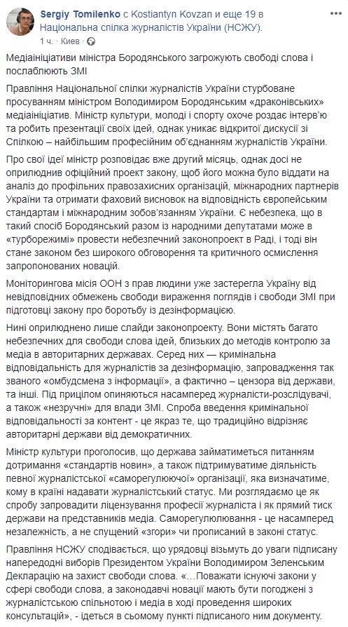 "О своих идеях министр рассказывает уже второй месяц, однако до сих пор не обнародовал официальный проект закона, чтобы его можно было отдать на анализ профильных правозащитных организаций, международных партнеров Украины и получить профессиональный вывод на соответствие европейским стандартам и международным обязательствам Украины. Есть опасность, что в таким способом Бородянский вместе с народными депутатами может в "турборежиме" провести опасный законопроект в Раде, и тогда он станет законом без широкого обсуждения и критического осмысления предложенных новаций", - написал глава НСЖУ.