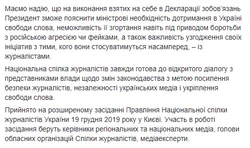 Также журналисты ждут, что во исполнение взятых на себя в Декларации обязательств президент сможет объяснить министру необходимость соблюдение в Украине свободы слова, невозможность ее свертывания под предлогом борьбы с российской агрессией или фейками, а также важность согласования своих инициатив с теми, кого они коснутся в первую очередь, – с журналистами.