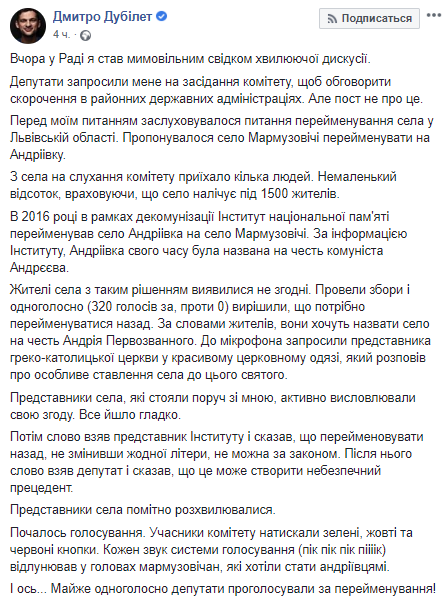 "Перед моим вопросом заслушивался вопрос переименования села во Львовской области. Предлагалось село Мармузовичи переименовать в Андреевку. Из села на слушания комитета приехало несколько человек", - рассказал Министр.