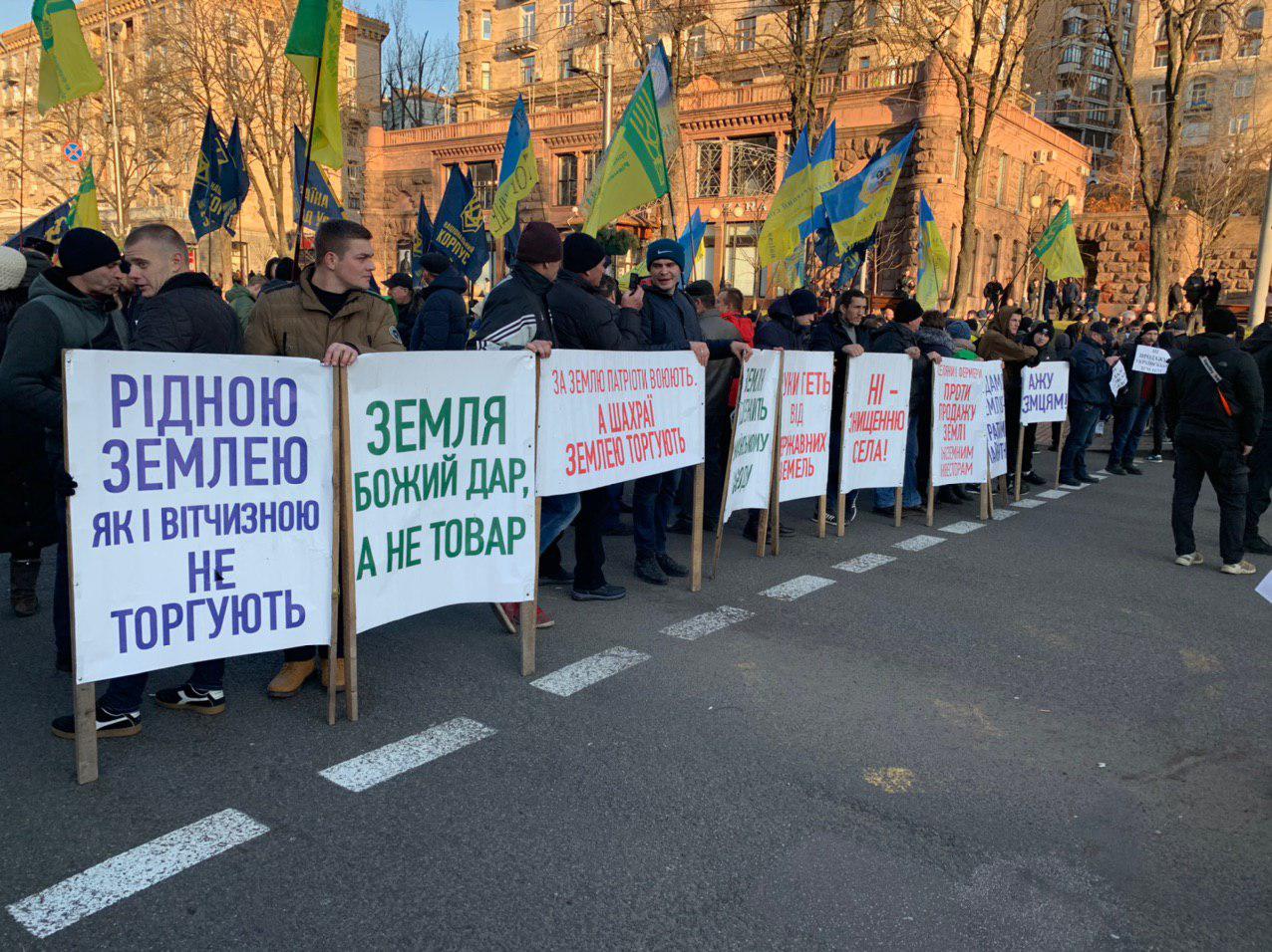 Протестующие держат государственные флаги и флаги Нацкорпуса. Также они держат плакаты с лозунгами: "Руки прочь от государственных земель!", "Земля - Божий дар, а не товар" ,"Нет - уничтожению села", "Продадим землю - потеряем будущее", "Землю - фермерам, а не олигархам".