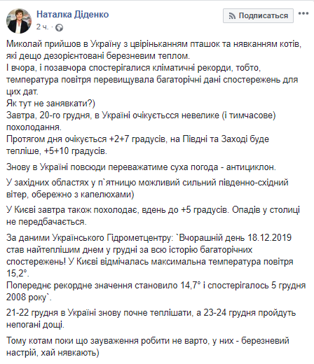 "Николай пришел в Украину с чириканием птиц и мяуканьем кошек, несколько дезориентированых мартовским теплом", - написала синоптик.