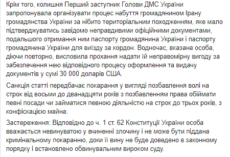 Также в сообщении говорится, что чиновница предложила организовать процесс приобретения гражданином Ирана гражданства Украины по якобы территориальному происхождению, которое должно было подтверждаться заведомо ложными официальными документамиь для дальнейшего получения им паспорта гражданина Украины и паспорта гражданина Украины для выезда за границу. За эту "услугу" чиновница просила 30 000 долларов США.