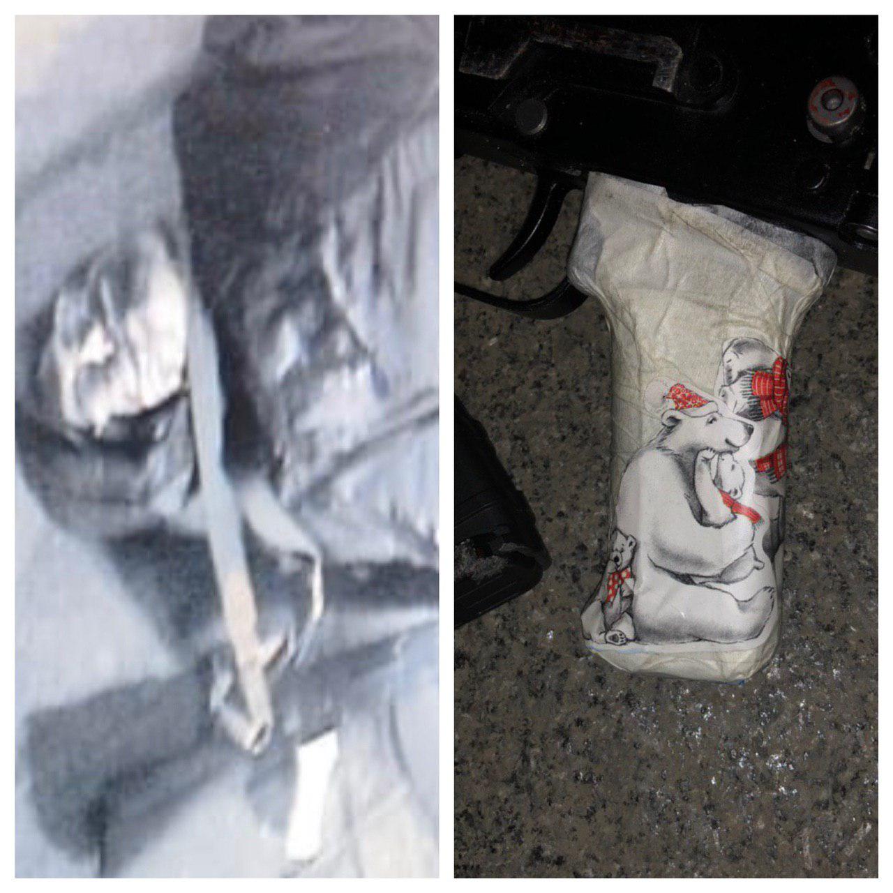 Как сообщают телеграм-каналы, на его оружии была такая вот странная рукоятка: