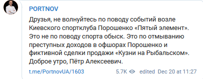 "Друзья, не волнуйтесь по поводу событий возле Киевского спортклуба Порошенко "5 элемент". Это не по поводу спорта обыск. Это по отмыванию преступных доходов в офшорах Порошенко и фиктивной сделки продажи "Кузни на Рыбальском", - написал Андрей Портнов.