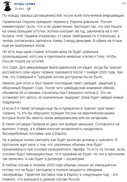 "Украинская сторона празднует перемогу. Европа довольна. Россия комментирует скупо. Что и не удивительно. Выглядит так, что она пошла на очень большие уступки. Хотела контракт на год, заключила на 5 лет. Хотела, чтоб Украина отказалась от своих требований по Стокгольму, а теперь согласилась заплатить Киеву 3 млрд деньгами. В обмен на отзыв еще не выигранных исков.