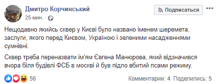 "Сквер надо переназвать именем Евгения Манюрова, который отличился вчера у здания ФСБ в москве и был подло убит псами режима", - написал он.