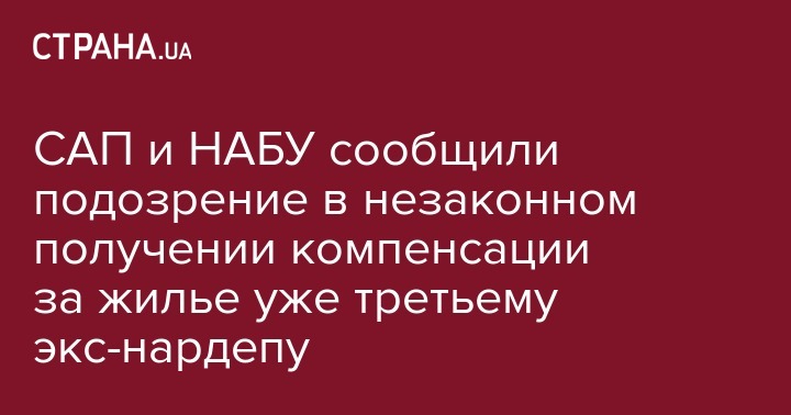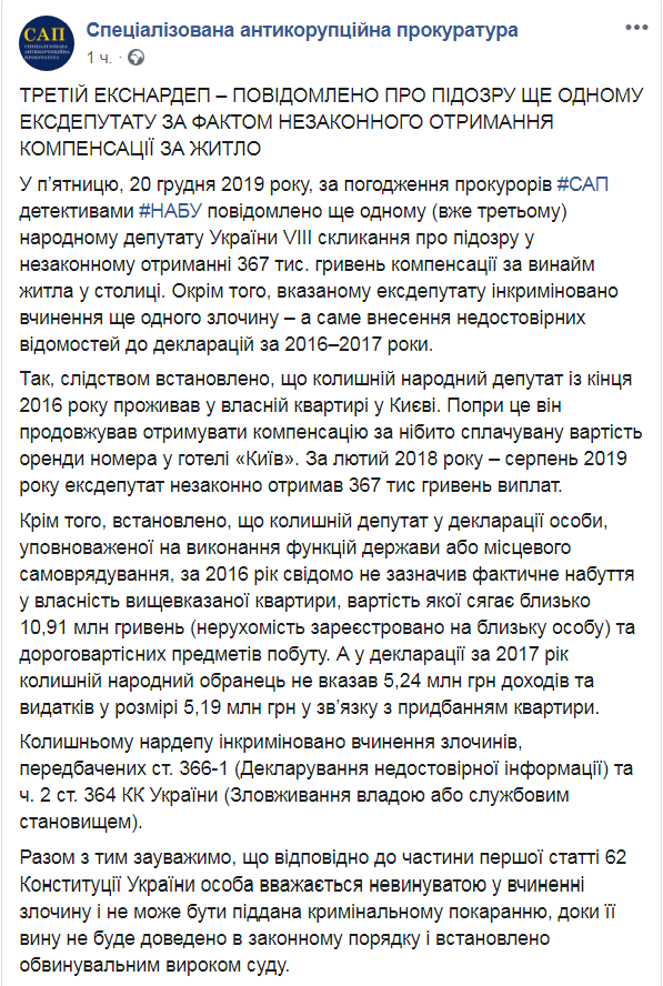 Специализированная антикоррупционная прокуратура (САП) и Национальное антикоррупционное бюро Украины (НАБУ) 20 декабря сообщили о подозрении третьему бывшему народному депутату по факту незаконного получения компенсации за съем жилья в Киеве. Об этом сообщается в Facebook прокуратуры.