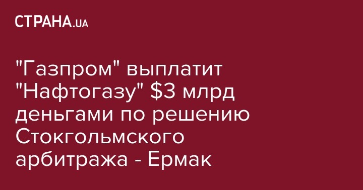 "Газпром" выплатит "Нафтогазу" $3 млрд деньгами по решению Стокгольмского арбитража - Ермак