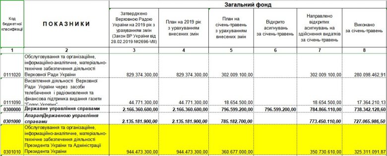 По месячными отчетами о выполнении Государственного бюджета Украины расходы на обслуживание и организационное, информационно-аналитическое, материально-техническое обеспечение деятельности президента Украины и его Администрации за первые пять месяцев текущего года (с января по май) составляют 325 300 000 гривен.