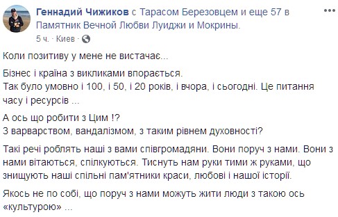 "Такие вещи делают наши с вами сограждане. Они рядом с нами. Они с нами здороваются, общаются. Жмут нам руки теми же руками, что уничтожают наши общие памятники красоты, любви и нашей истории. Как-то не по себе, что рядом с нами могут жить люди с такой вот "культурой", - подчеркнул он.