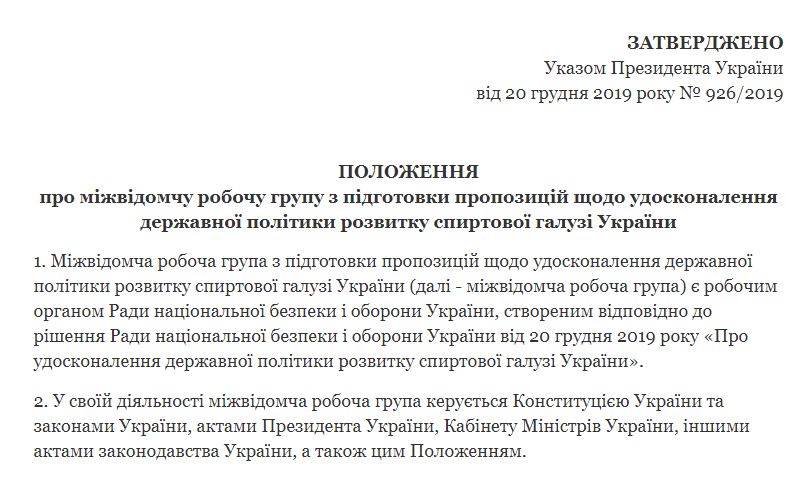 Согласно информации, основная задача рабочей группы заключается в подготовке Совету национальной безопасности и обороны Украины предложений по решению проблемных вопросов относительно реализации госполитики в области производства, оборота спирта и алкогольных напитков.