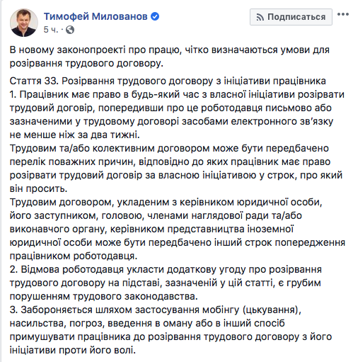Он опубликовал у себя в Facebook выдержки из норм проекта ТК.