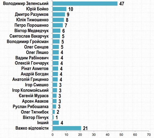 За Юрия Бойко, Дмитрия Разумкова и Юлию Тимошенко проголосовали по 8-10% опрошенных, Петр Порошенко, Виктор Медведчук, Святослав Вакарчук и Владимир Гройсман набрали по 5-7%.