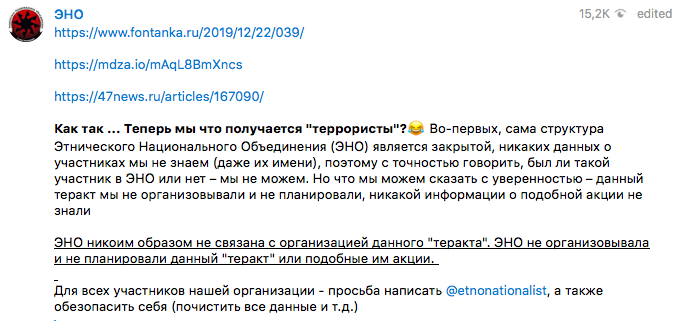Телеграм-канал этой организации был создан 2 ноября 2018 года. Вскоре там были опубликованы статьи: "Как уничтожают национализм" и "Камрад, прочти!"