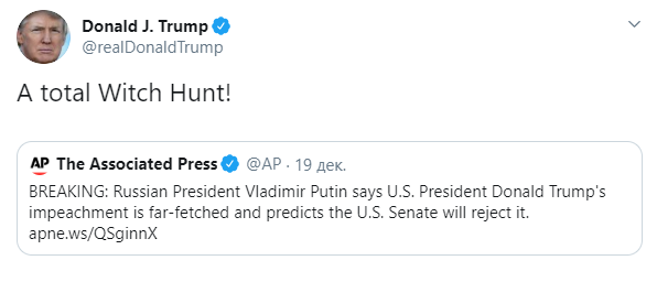Президент США Дональд Трамп обратил внимание общественности на сообщение агентства Assosiated Press, которое цитирует главу российского государства Владимира Путина, защитившего Трампа в вопросе импичмента. 21 декабря американский президент в своем микроблоге в Twitter ретвитнул сообщение агентства.