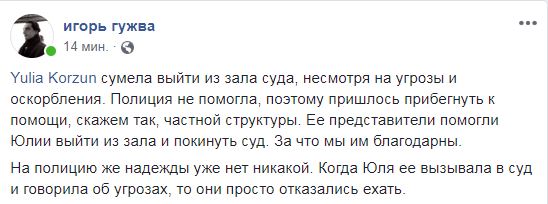 "Юля Корзун сумела выйти из зала суда, несмотря на угрозы и оскорбления. Полиция не помогла, поэтому пришлось прибегнуть к помощи, скажем так, частной структуры. Ее представители помогли Юлии выйти из зала и покинуть суд. За что мы им благодарны", - сообщил он.
