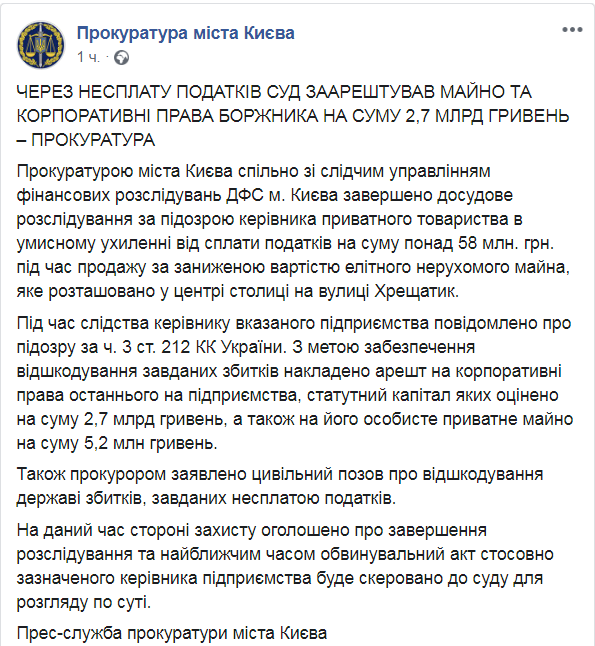 Владелец арестованного имущества, руководитель частного общества, подозревается в умышленном уклонении от уплаты налогов на сумму более 58 млн грн во время продажи по сниженной стоимости элитной недвижимости на Крещатике. Его действия квалифицировали по ч.3 ст.212 Уголовного кодекса Украины (уклонение от уплаты налогов).