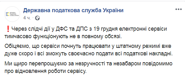 "Из-за следственных действий в ГФС и ГНС с 19 декабря электронные сервисы временно функционируют не в полном объеме. Обещаем, что сервисы начнут работать в штатном режиме уже очень скоро и все смогут вовремя подать все налоговые накладные", - успокоили в службе подписчиков.