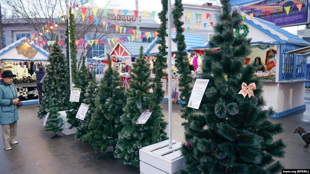 На новогодней ярмарке в Симферополе, которая проходит под зданием музыкального театра на проспекте Кирова, начали продавать искусственные ели из украинского Прикарпатья, передают Крым.Реалии.