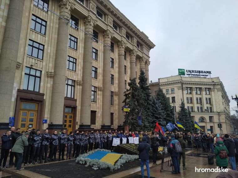 В Харькове возле здания облгосадминистрации около двухсот активистов "Национального корпуса", "Правого сектора", "Фрайкора" и общественной организации "Традиции и порядок" протестуют против возможного обмена обвиняемых в теракте возле Дворца спорта в 2015 году. Об этом сообщает Hromadske.