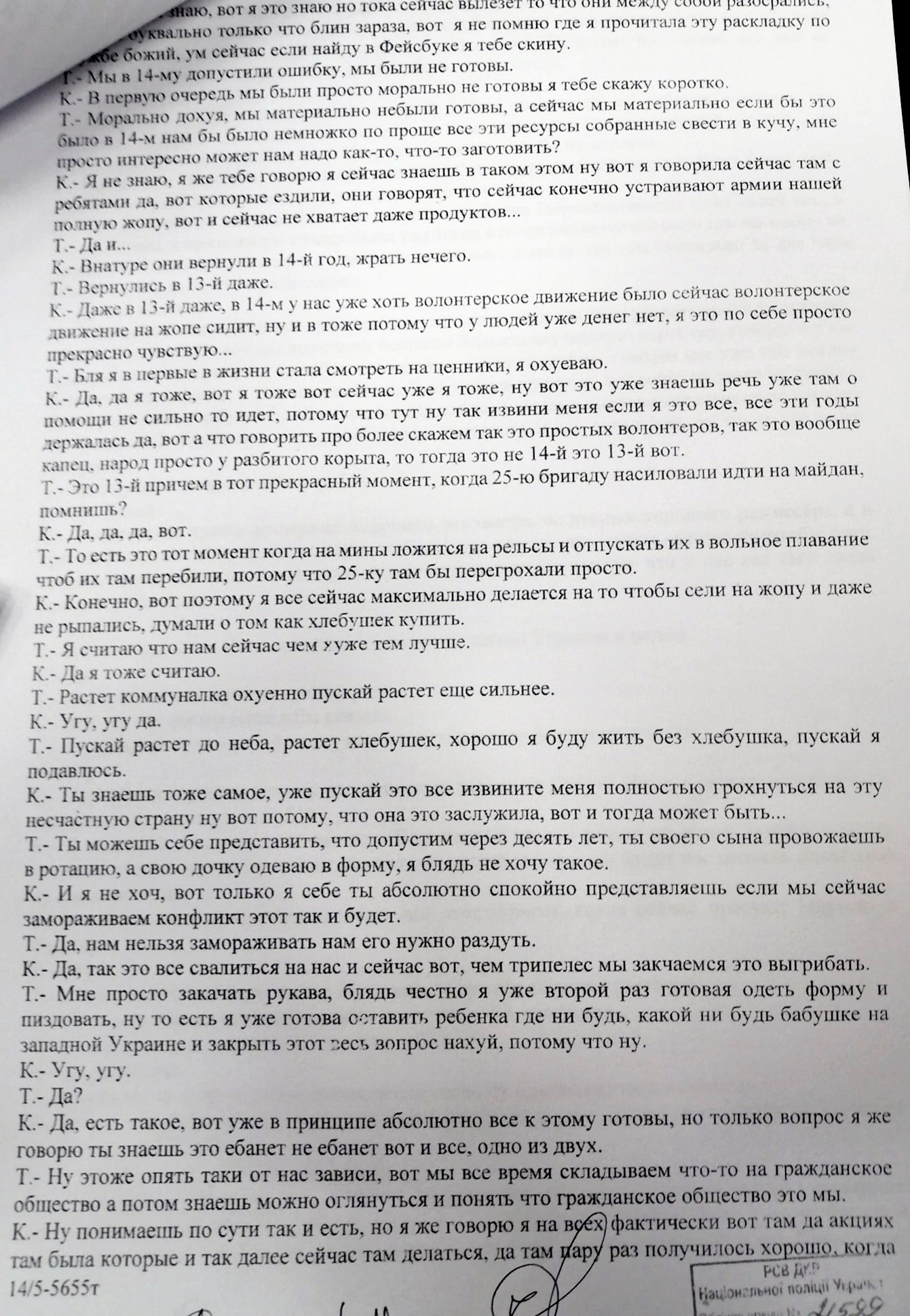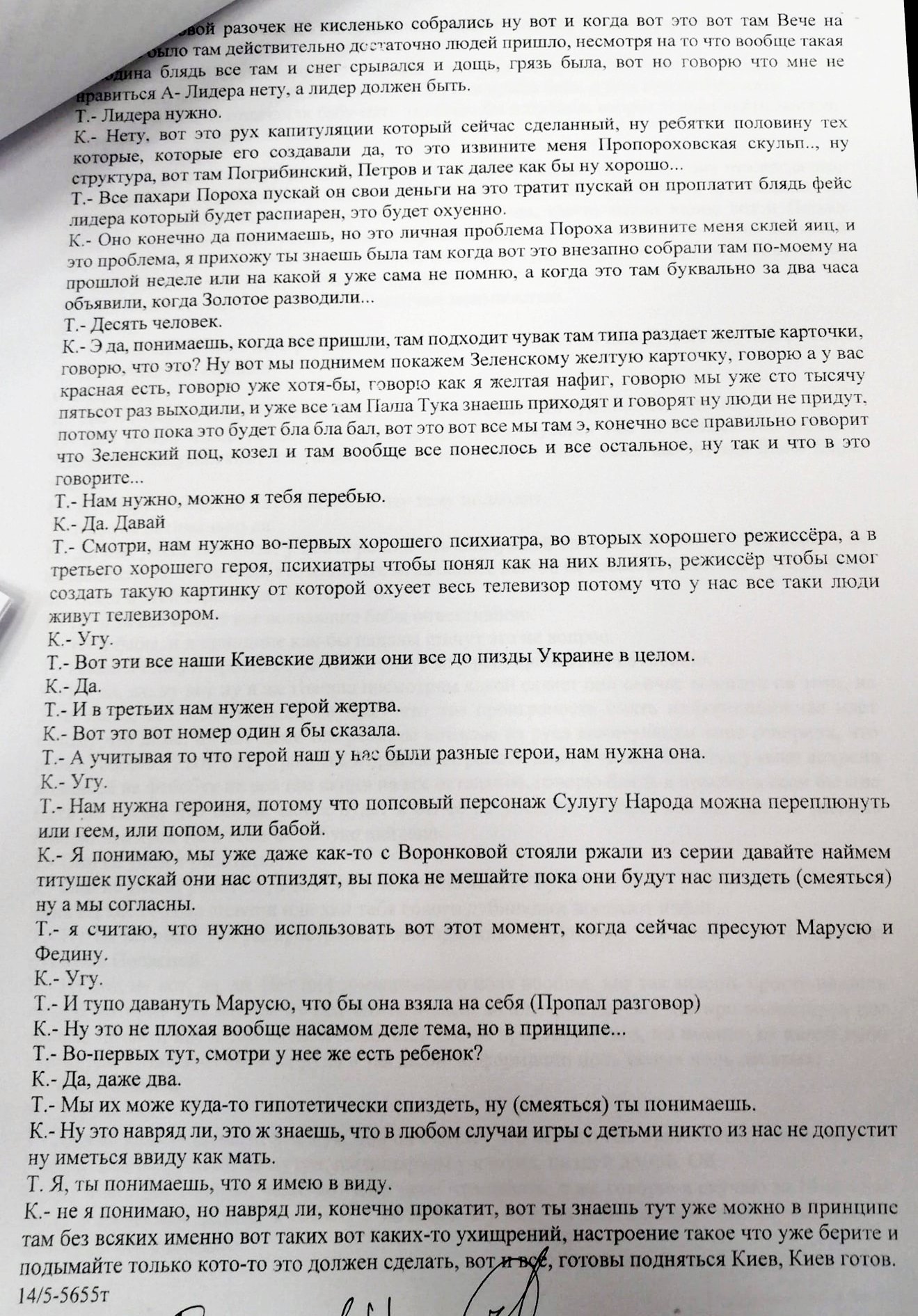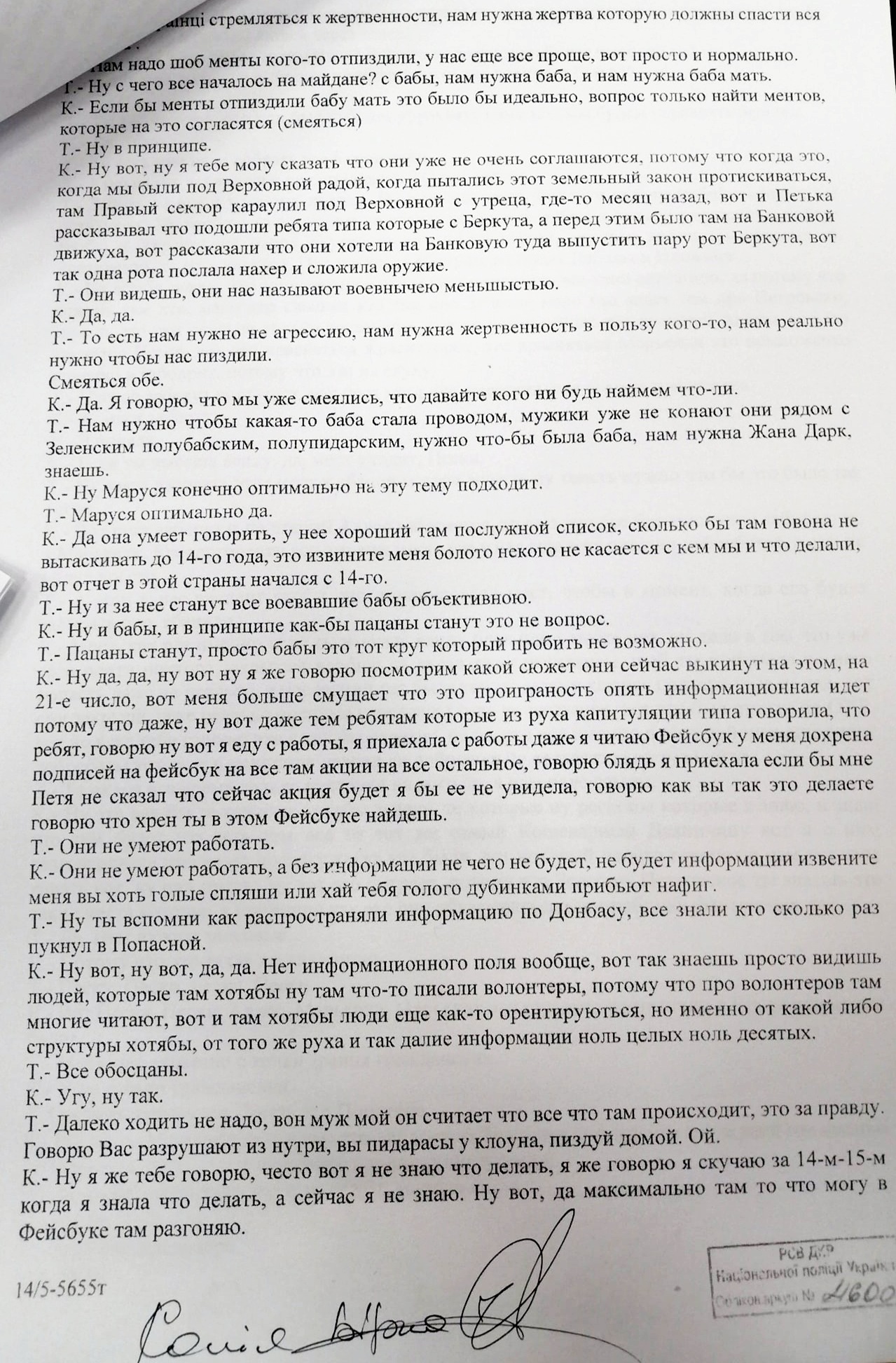 "На брифинге МВД, а затем и в суде был публично открыт разговор Юлии Кузьменко с лицом Т, в которой говорится о Маруся Зверобой, где будто бы Юля что-то страшное планирует против Маруси и ее детей! А теперь внимание, расшифровка разговора с контекстом в котором об этом говорилось. И пусть мне кто-то скажет, что это не политическое дело и не расправа! И где здесь Шеремет?! Вопрос: кому это выгодно ?! К - это Кузьменко, Т -собеседница!" - написал адвокат в соцсети.