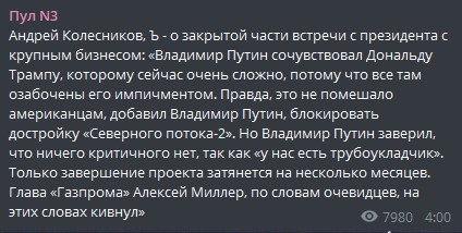 "Владимир Путин сочувствовал Дональду Трампу, которому сейчас очень сложно, потому что все там озабочены его импичментом. Правда, это не помешало американцам, добавил Владимир Путин, блокировать достройку "Северного потока-2". Но Владимир Путин заверил, что ничего критичного нет, так как "у нас есть трубоукладчик". Только завершение проекта затянется на несколько месяцев. Глава "Газпрома" Алексей Миллер, по словам очевидцев, на этих словах кивнул", - говорится в сообщении.