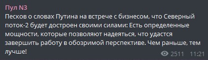 Также, как пишет Смирнов, пресс-секретарь Путина Дмитрий Песков на встрече с представителями бизнеса сказал, что Северный поток-2 будет достроен своими силами.
